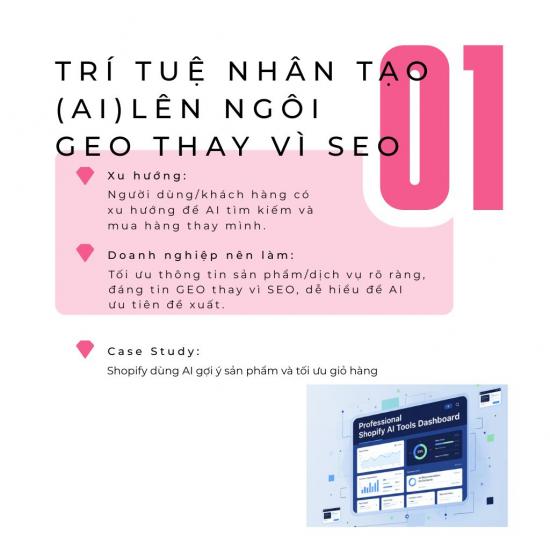 Trước đây thay tối ưu để lên Top Google (SEO), nhưng giờ khách hàng thích hỏi ChatGPT hay Gemini hơn. Để AI chọn bạn làm câu trả lời duy nhất, bạn cần làm GEO. Hãy viết thông tin sản phẩm cực kỳ rõ ràng, minh bạch và có số liệu cụ thể. AI rất thích dữ liệu "sạch" và đáng tin. Đừng viết chung chung, hãy viết chi tiết!