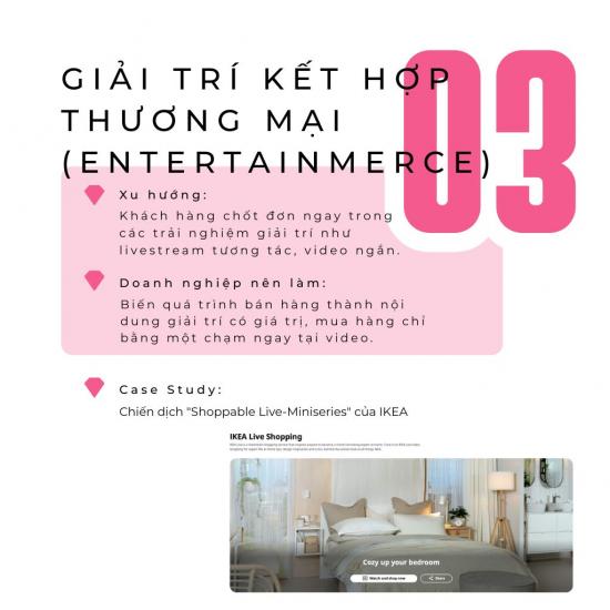 Đã qua rồi thời khách hàng ngồi đọc danh sách sản phẩm khô khan. Giờ đây, họ muốn vừa xem phim, vừa xem livestream giải trí mà vẫn có thể chốt đơn ngay tại chỗ. Hãy biến việc bán hàng thành nội dung giải trí. Một video ngắn có cốt truyện hay, tích hợp nút "chạm để mua" sẽ hiệu quả hơn ngàn bài quảng cáo truyền thống.